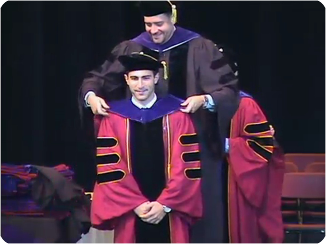 New York state, that is! We spent the day in Albany yesterday, visiting with Nikos' godparents and their two sons, one of whom was graduating from law school (the real reason everyone was there). We didn't attend the graduation, since we wouldn't have been able to make it there on time, but we did actually watch it as it was streaming live on the internet, haha! We got to watch Nikos' godbrother receive his hood. I even took a screen shot! It's a little blurry, but this was the big moment!